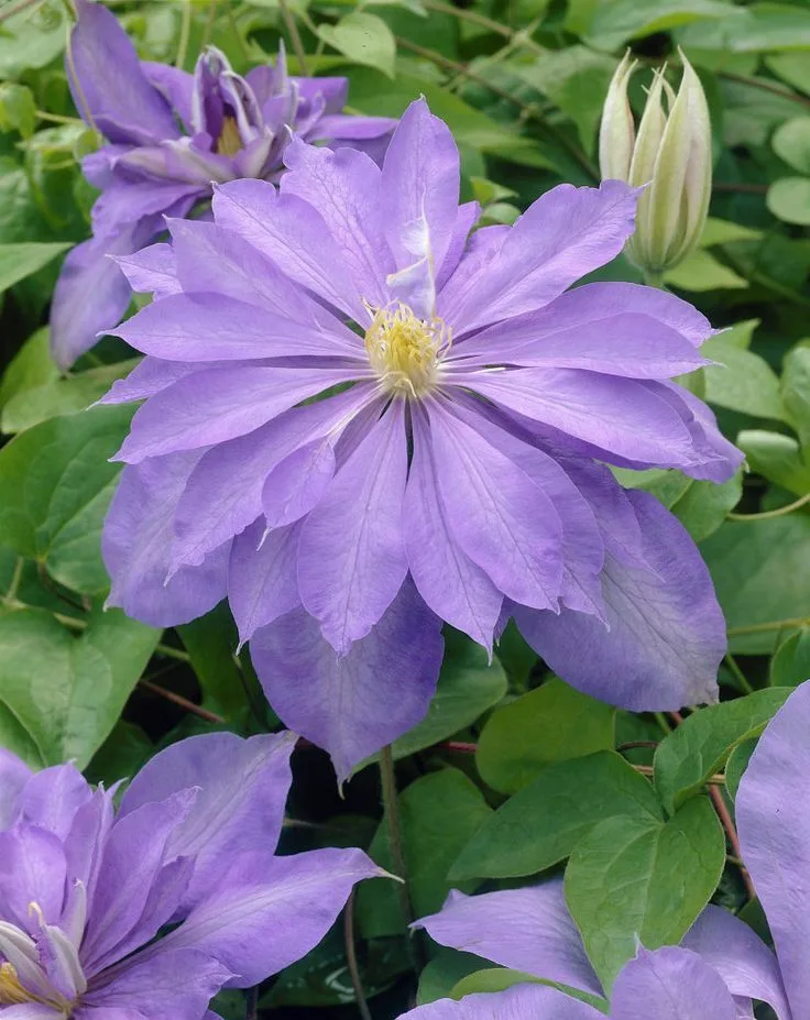 Клематис Кантес Оф Лавлейс (Countess of Lovelace) — изысканный сорт с роскошными махровыми цветками лавандово-голубого оттенка, придающими саду нотку утончённости и лёгкой аристократичности. Этот клематис завоевал популярность за счёт обильного цветения и необычной формы цветков, напоминающих пышные георгины. Обильно цветёт в начале лета мае-июне на прошлогодних побегах махровыми цветами, после чего продолжает цветение на новых побегах во второй половине сезона одиночными. Цветки крупные достигают 12–15 см в диаметре, имеют густомахровую форму, лепестки меняют оттенок от голубовато-лавандового до сиреневого по мере цветения. Высота куста составляет около 2–3 м, что позволяет ему обильно и эффектно покрывать любые садовые конструкции. Зимостойкость до -29°C делает его подходящим для холодного климата. Сорт относится ко 2 группе обрезки. Этот сорт прекрасно подходит для украшения пергол, арок, беседок и декоративных ограждений. Clematis Countess of Lovelace хорошо смотрится в сочетании с розами, особенно пастельных оттенков, а также с другими декоративными кустарниками . Его мягкие лавандовые тона удачно дополняют садовые композиции в светлых, холодных и пастельных цветах, создавая изящный и романтичный акцент в любом уголке сада. Рекомендации по уходу Перед посадкой необходимо подробно ознакомится с сортом клематиса: предпочитает тенистые или солнечные места. Нельзя забывать, что врагом всех клематисов является ветер, поэтому места надо выбирать мало продуваемые. Нужно обязательно подумать об опорах, по которым будет карабкаться Ваша лиана, они должны быть не менее 1,5 м. Посадка производится в заранее подготовленную яму 50х50, если почвы лёгкие, и 70х70 для более плотных, предварительно удобрив суперфосфатом и перегноем. Расстояние между саженцами также необходимо соблюдать, не менее 70 см между ямками.
