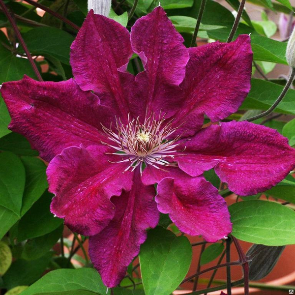 Клематис Эрнест Маркхем — сорт английской селекции из группы Жакмана . Широко используется для украшения беседок, пергол, входа в дом. Сорт выделяется среди своих аналогов необыкновенной привлекательностью и несложным уходом. Название растение получило в честь селекционера, который его и вывел — Э. Маркхема. Начиная с 1936 года, эта лиана радует своих владельцев по всему миру. В нашей стране клематис поселился во всех садах и парках, радуя людей в местах отдыха своим буйным и ярким цветением. Посадки клематиса Эрнест Маркхем отличаются активным цветением крупными ярко-красными цветками с образованием огромного количества бутонов. Цветение продолжается с июня по октябрь, распустившиеся цветки имеют диаметр до 15 см. Каждый из них сформирован из 5-6 лепестков с волнистыми краями, тычинки кремового цвета. Поверхность их при прикосновении ощущается как бархат, а на солнце сильно блестит. Куст английского клематиса Ernest Markham отличается интенсивным ростом, вырастает в высоту до 4 м, в диаметре до 1,5 м . Толщина побегов с ребристой поверхностью и небольшим опушением бывает до 20 мм. Стебель имеет коричнево-серую окраску. Они отличаются удивительной гибкостью, что дает им возможность быстро оплетать опору и переплетаться между собой. Эта особенность позволяет выращивать сорт на естественных или специально установленных опорах, в открытом грунте. Листья, окрашенные в темно-изумрудные оттенки, в ширину достигают 5-6 см. Края листочков волнистые. К опоре они крепятся с помощью длинных черешков. Куст формирует мощный стержневой корень и множество ответвлений, которые вырастают длиной до 1 м Чтобы растение красиво и щедро цвело, саженцы клематиса Ernest Markham высаживают на южной стороне участка , где лиана хорошо освещается солнцем, так как растение относят к светолюбивым. Необходимо избегать ветреных мест. Допускается рассеянное освещение в течение всего дня. Продолжительность светового дня должна быть не менее 5 часов. Лиана не выносит кислых почв и тяжелых грунтов, нужна рыхлая почва с хорошей аэрацией.