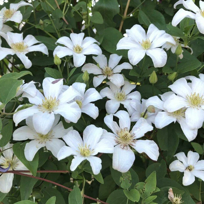 Клематис Хулдин — удивительно красивый и щедро цветущий сорт, относится к сильнорослым лианам. Цветет крупными жемчужно-белыми цветками. Французский сорт относится к группе Viticella, он отличается отменным здоровьем и не требует особого ухода. Используют его для декорирования беседок, арок, пергол, стен, лестниц. Цветение продолжается долго, радуя роскошными цветами с середины июня по сентябрь. С помощью растений этого сорта легко превратить самую унылую стену в белоснежную сказочную красоту. Такой окрас цветков безусловно освежит беседку, балкон, террасу или клумбу. Французский клематис Huldine цветет крупными цветками диаметром до 15 см. Если их очень много, то цветки мельчают, когда их мало, они очень крупные. Цветение с возрастом становится только пышнее и продолжительнее. Чем старше куст, тем длиннее период цветения и больше бутонов дает лиана. Лепестков в цветке всегда 6, каждый из них с изящным тиснением. На тыльной стороне прожилки с легким розовым оттенком. Сорт весьма требователен к освещенности, поэтому в южных регионах достигает своей максимальной высоты — 5 м. В средней полосе вырастает до 3 м. Его относят к 3 группе обрезки, это означает, что перед наступлением холодов побеги укорачивают на высоту 15-20 см. Рекомендации по уходу Посадки клематиса Хулдин прекрасно отзываются на мульчирование . Для этого используют хвойный опад, лиственную и сосновую кору, щепу, опилки. Опытные садоводы советуют формировать приствольный круг бордюрной лентой. Это делается для сохранения влаги и мульчирующего материала. Перед наступлением морозов растение укрывают и окучивают. Саженцы сорта Huldine в первые 3 года активно наращивают корневую систему, потому формируют всего 2-5 побегов. Они начинают активно расти только на пятый год жизни, значительно расширяясь в стороны. С этого момента и начинается наиболее обильное цветение. Цветки образуются на высоте от 50-70 см. Сорт прекрасно смотрится в совместных посадках с ярко-красными сортами, например, клематисом Вестерплатте. Посаженные рядом, они переплетаются, получается удивительный «ковер» — красные цветки на белоснежном фоне Хулдин. Точно так же можно выбрать и другие яркие сорта для совместной посадки.