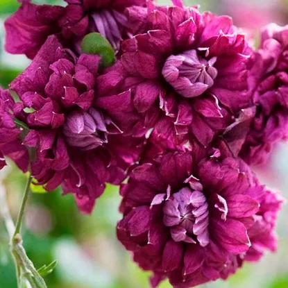Клематис Purpurea Plena Elegans (Пурпуреа Плена Элеганс) станет поистине королевским украшением Вашего сада, благодаря яркости и насыщенности цветов, он будет поднимать вам настроение при одном только взгляде на этот шедевр природы. Мы подготовили для Вас подробное описание клематиса Purpurea Plena Elegans . Поражающй своей роскошью клематис Пурпуреа Плена Элеганс будет радовать Вас своим роскошным цветением весь летний сезон, начиная с июня и заканчивая сентябрем. Не смотря на небольшой цветок диаметром всего 5-8 см, вы останетесь довольны, наслаждаясь его густомахровыми цветами темно-бардового цвета. Отличительная черта клематиса сорта Purpurea Plena Elegans заключается в полном отсутствии тычинок и необычной сильно-текстурированной форме чашелистиков. Среднерослый клематис Purpurea Plena Elegans с сочными насыщено-зелеными листиками, достигает высоты около 3 м. Очень любит солнечное пространство, и при этом не прихотлив к почве. Положительные отзывы о клематисах Пурпуреа Плена Элеганс получили широкое распространение по всей России. Для обрезки 3го типа необходимо производить сильную обрезку, оставив побеги с 2-3 парами почек длинною 20-50 см над землёй. Такая обрезка позволяет быстро набрать силу растению в период цветения. Перед посадкой необходимо подробно ознакомится с сортом клематиса: предпочитает тенистые или солнечные места. Нельзя забывать, что врагом всех клематисов является ветер, поэтому места надо выбирать мало продуваемые. Нужно обязательно подумать об опорах, по которым будет карабкаться Ваша лиана, они должны быть не менее 1,5 м. Посадка производится в заранее подготовленную яму 50х50, если почвы лёгкие, и 70х70 для более плотных, предварительно удобрив суперфосфатом и перегноем. Расстояние между саженцами также необходимо соблюдать, не менее 70 см между ямками.