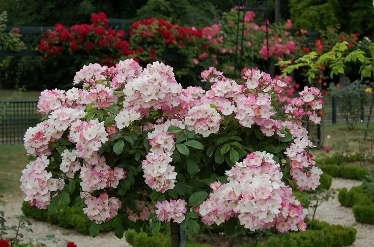 У этого сорта простые цветки, тем не менее, он очень популярен. Это объясняется огромным их количеством: Ballerina цветет непрерывно до первых морозов, а кисти цветков становятся больше и больше со временем. Отдельные цветки, раскрывшись, темно-розовые, быстро выгорают, и демонстрируют белый глазок в центре, увеличивающийся в размерах, до тех пор, пока не останется лишь тонкая розовая окантовка по краям. Тычинки вначале очень красивые, но они тоже быстро выгорают и становятся коричневыми. После цветков появляются мелкие оранжевые плоды. Сорт очень вынослив и устойчив к заболеваниям, с ярко-зеленой листвой и небольшим количеством крупных шипов. Лучше всего позволить сорту вырасти до естественных размеров и формы, не подвергая обрезке, тогда куст будет округлым и шаровидным, хотя можно выращивать его и как невысокий клаймбер рядом с южной стеной. Особенно хорошо смотрится в качестве бордюрного растения, и при посадке в живой изгороди. Очень легок в выращивании. В жарком климате хорошо растет в полутени, где меньше выгорает. (ARE) Хотя официально Ballerina считается гибридом мускусной розы, на самом деле, она ближе к сильнорослой полиантовой розе с большими кистями мелких цветков без запаха. Возможно, ее следует классифицировать как шраб. Сорт имеет множество поклонников за компактный куст (достигает 1,5м в высоту и ширину), выносливость (один из самых легких в выращивании сортов, и необыкновенная обильность и продолжительность цветения. Ярко-зеленая листва очень устойчива к заболеваниям. (URB) Эта заслуженно популярная роза летом усыпана массой мелких изящных нежно-розовых цветков с белым центром и более бледной оборотной стороной, после которых появляются мелкие оранжевые плоды. Куст достигает 1,2 м в высоту, красивой формы, цветки оттеняет густая зеленая листва. Цветет очень обильно и продолжительно. Хорошо подходит для выращивания в контейнерах, и для невысоких изгородей. (IER) Изящные цветки 2,5 см в диаметре с золотыми тычинками и белым пятнышком в центре. Кисти цветков покрывают весь куст. Часто называют «гортензиевого типа». Цветет почти непрерывно. Побеги почти без шипов. (GRCC) Сложно придумать, что можно было бы улучшить в этой замечательной, легкой в выращивании мускусной розе – пожалуй, разве что добавить больше аромата. Ballerina цветет немахровыми чашевидными а затем плоскими цветками поздней весной и ранним летом, затем в середине лета следует умеренное повторное цветение, а осенью – еще одно обильное. У каждого цветка нежно-розовые лепестки с более темными краями. В центре они выгорают почти до белых, акцент создают яркие желтые тычинки, которые быстро темнеют, как только цветки распустятся. Отдельные цветки мелкие, 3-5 см, но появляются в крупных округлых кистях, создавая впечатляющее зрелище. Осенью куст покрывается ярко-красными плодами. Побеги дуговидно поникают, они слегка колючие, и густо покрыты светло-зеленой листвой. Куст сравнительно компактный. Сорт достаточно хорош для солитерной посадки, но великолепно смотрится и в сочетании с многолетниками, либо в живой изгороди. Очень хорошая устойчивость к болезням. (TGR) Теневыносливый сорт.