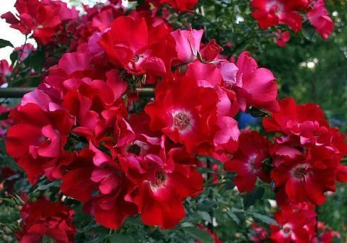 Превосходный невысокий клаймбер для маленьких садов. Цветки насыщенного вишнево-красного цвета, с крупным белым пятном в центре, и большим пучком ярко-желтых тычинок – очень яркая комбинация. Цветки появляются в крупных кистях по 3-11 шт. Затем появляются оранжевые плоды, но это снижает обильность цветения осенью, так что обрывание отцветающих цветков необходимо для тех, кто готов принести плоды в жертву ради большего количества цветков. Листва темно-зеленая, блестящая. Очень устойчива к заболеваниям. Куст ветвистый, густооблиственный, до 3 м высотой, можно обрезать и выращивать как шраб. Сертифицирована по системе ADRв 1954 г.(ARE) У меня коты прямо влюбились в эту розу и проводили под ней свои оргии. Нуждается в регулярном удалении отцветающих цветков, иначе смотрится неряшливо. Белый глазок в центре придает сорту оригинальность. (RRC) Удлиненные бутоны раскрываются в крупные немахровые ярко-красные цветки с белым глазком. Куст прямостоячий, сильнорослый, достигает 2,5 м в высоту. Цветет практически непрерывно все лето и осень. Выносит бедные почвы. (IER) Яркая немахровая роза со множеством хороших характеристик. Цветки кроваво-красные с белым центром, лепестки слегка волнистые. Листва также яркая – темная, блестящая, как будто листья покрыты воском. Из-за яркого цвета розу следует аккуратно размещать в саду, т.к. она может затмить все вокруг. Повторное цветение более обильное если обрезать отцветшие соцветия. Нуждается в полном солнце, не будет расти в полутени. (Oliver) Эта роза – привлекающий к себе внимание невысокий клаймбер, покрытый крупными (11-12 см), открытыми, немахровыми цветками с легким ароматом в крупных кистях. Они яркого, красивого красного цвета с крупным белым пятном в центре и пучком ярко-желтых тычинок. Комбинация очень яркая, но такой цвет сложно комбинировать. Листва блестящая, очень темная, устойчивая к заболеваниям. Для стимулирования повторного цветения следует обрезать образующиеся плоды. Куст ветвистый, достигает 3 м. (CRW) Обильно цветущий и беспроблемный, этот гибрид kordesii – любимец многих садоводов. Цветки немахровые, слегка чашевидные, с волнистыми лепестками, достигают 8-9 см в диаметре. Каждый ярко-красный цветок имеет акцент в центре – белый глазок, окружающий пучок золотых тычинок. Аромат очень слабый. Dortmund открывает сезон поздней весной впечатляющим зрелищем крупных, привлекающих взгляд цветочных кистей, затем следуют повторные волны цветения весь сезон. Отцветшие цветки превращаются в крупные, округлые, оранжевые плоды. Побеги очень колючие. Листва мелкая, очень блестящая, темно-зеленая. Зимостоек (4 зона). Если у вас достаточно места, позвольте этой розе расти кустом. Однако, чаще Dortmund сажают как плетистую розу. В холодном климате на опоре достигает 250-300 см. В теплых странах может дорасти и до 10 м. После первого цветения нуждается в регулярном удалении отцветших цветков: это требует времени и довольно неприятно из-за колючих побегов. Без обрезки вы увидите гораздо меньше цветов позднее, но получите щедрый урожай плодов. Нижняя часть куста оголяется, так что подсадите в ноги низкий пушистый куст, чтобы спрятать «голые ноги». Проблем с болезнями почти не бывает. (TGR)