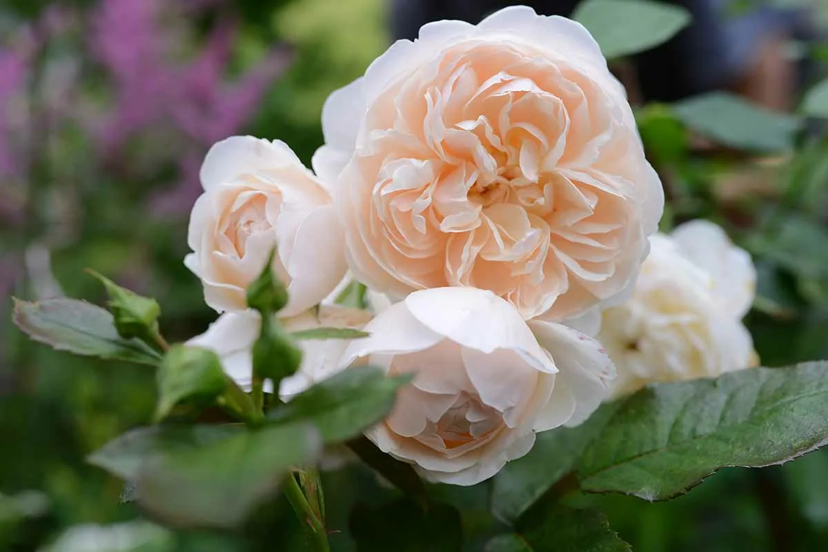 Персиково-розовые бутоны постепенно распускаются в аккуратные чашевидные розетки. Каждый цветок представляет собой идеальный круг кремово-абрикосовых плотных восковых лепестков, окружающих мелкие внутренние лепестки. Со временем внешние лепестки отгибаются вниз, образуя огромный помпон кремово-белого цвета. В массе цветок выглядит почти чисто белым. Куст сильный, округлой формы, цветки изящно поникают. Очень подходит для бордера, гармонирует с другими цветами, может служить посредником между розовыми и желтыми цветами. Аромат легкий, на определенной стадии с заметными нотами гвоздики. (AUS)
