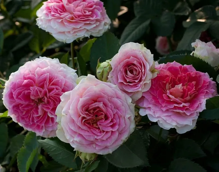 Широкие, очень сильно волнистые лепестки свернуты в центре цветка, так что темно-розовая внешняя сторона лепестков красиво контрастирует с нежно-абрикосовым реверсом. Цветки быстро раскрываются, они густомахровые и округлой формы, но почти никогда не показывают серединку. Лучше всего сорт показывает себя в теплых, сухих условиях. Желтый оттенок со временем выгорает, так что более старые цветки становятся бело-розовыми. Куст достигает 2 м при выращивании кустом, но побеги склоняются под весом кистей цветков ( в кистях обычно 3-9 шт), та что лучше выращивать эту розу на опоре. Листва устойчива к заболеваниям.