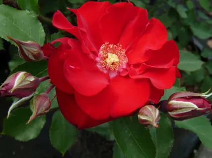Очень сильный новый сорт, может использоваться как невысокая плетистая роза при благоприятных климатических условиях. Зимостоек. Цветки насыщенно-красные, очень яркие, полумахровые. Появляются в кистях по 10-12 шт. Листва темно-зеленая, средних размеров, куст раскидистый, ветвистый, до 120 см. (KOR)