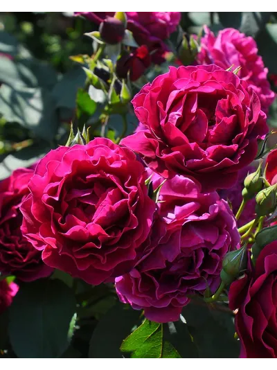 Крупный куст, сильный, аромат зеленого яблока, меда, специй. Цветок крупный, полный (26-40 лепестков) чашевидный, взъерошенный. Цветет приливами в течение всего сезона. Описание: Цветы глубокого пурпурно-красного оттенка с легкой волной по краю. Аромат сильный, зеленого яблока и меда. Цветение повторное, волнами в течение всего сезона. Цветок крупный, полный (26-40 лепестков), чашевидной, гофрированной формы.