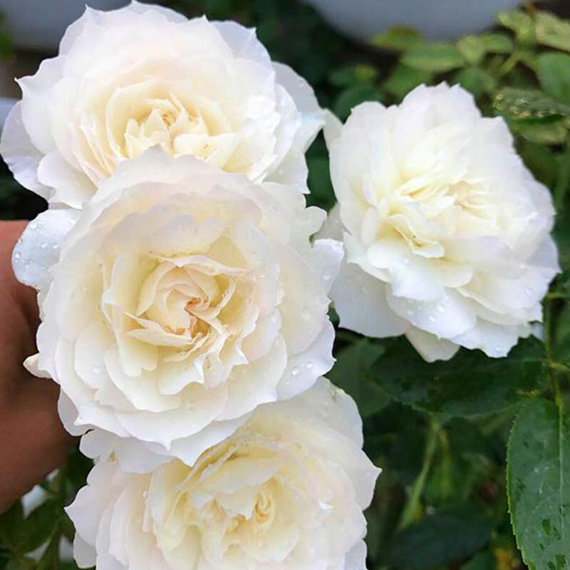 Флорибунда Цветы белые, красивые и нежные. Куст компактный, крепкий, устойчивый к жаркой погоде. Листва матовая. Цветки плоские, густомахровые, в старинном стиле, появляются в небольших кистях, как правило по 3-5 шт. и более. При полном роспуске в центре цветка лепестки имеют едва заметный зеленоватый оттенок. Цветение достаточно продолжительное в две четко выраженные волны. Считается одной из самых красивых японских белых роз.